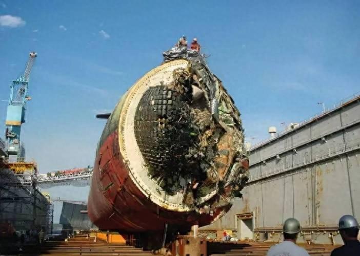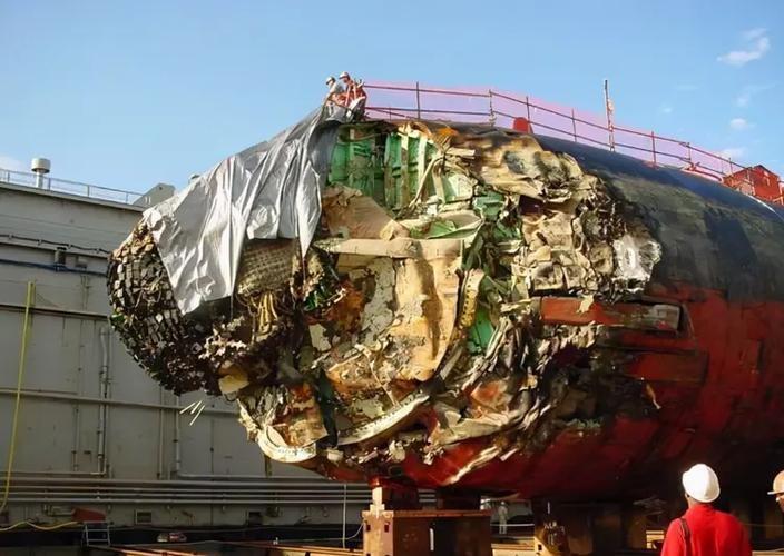事故現場慘不忍睹。根據後續流出的照片,這艘潛艇的艇艏聲吶罩徹底撞爛,裏面昂貴的聲吶陣列像爛泥一樣掛着,底部的壓載艙也廢了。