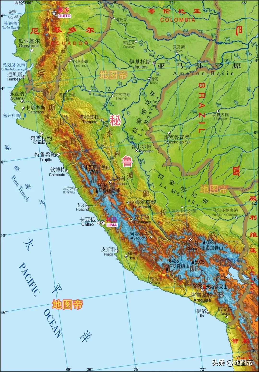 祕魯地勢中間高東西低,中間是安第斯山脈,西部是沿海沙漠,東邊是熱帶雨林,森林覆蓋率58%,最高峯瓦斯卡蘭山,海拔6768米,頂部終年積雪。