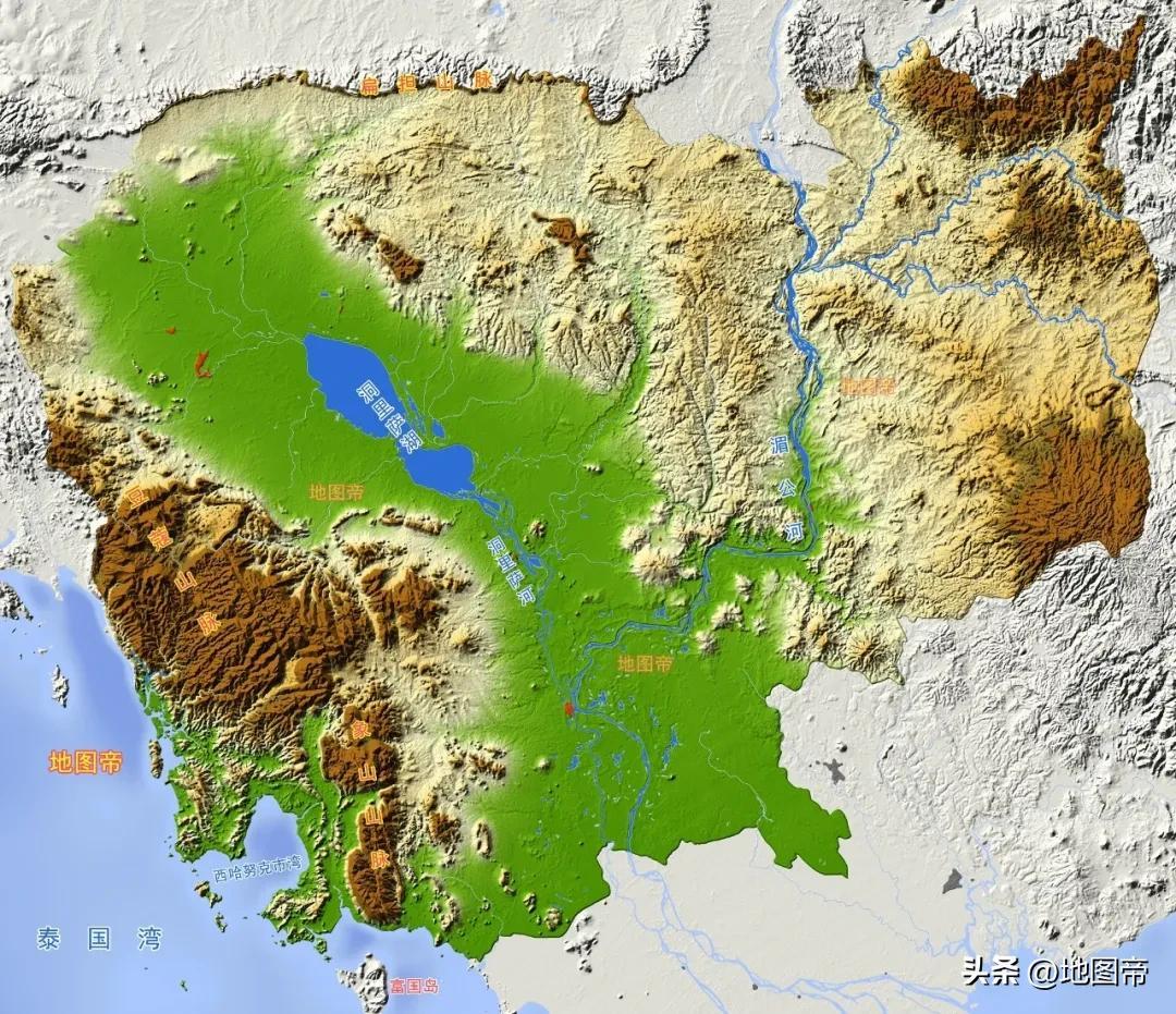 柬埔寨地形三面高,北有扁擔山脈,東北有長山山脈,西南有豆蔻山脈,中部爲廣闊的湄公河沖積平原,湄公河自西北向東南穿過,洞裏薩湖是東南亞最大的湖泊。