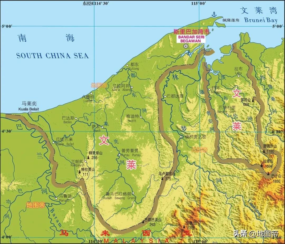 文萊位於加里曼丹島西北部,是馬來西亞的國中國,且其兩塊領土並不相連,被馬來西亞沙撈越州的林夢分隔爲東西兩部分。文萊面積5765平方千米,約爲我國上海的九成大小,放在我國省級行政區中居第三十三位。