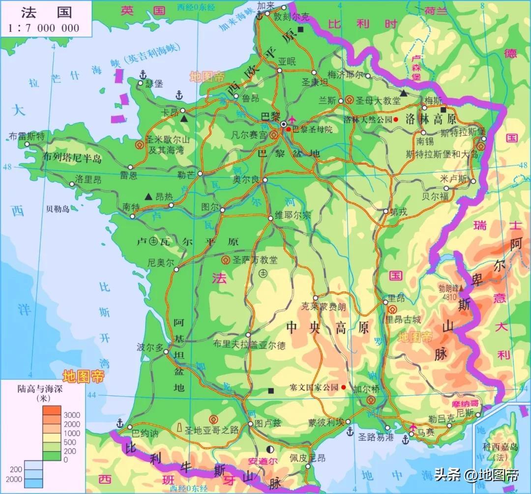 法國本土西部瀕大西洋,東南臨地中海,陸地邊境線長2913千米,海岸線長3424千米;海外領地邊境線長1263千米,海岸線長2000千米。