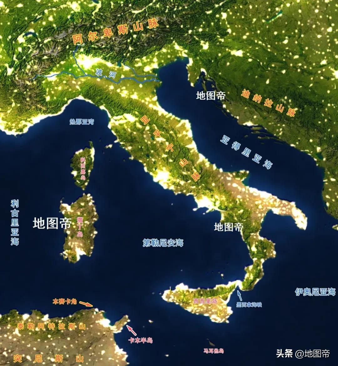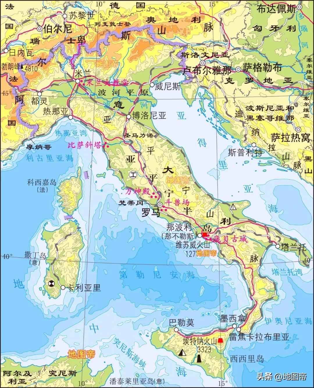 意大利位於歐洲南部,地處阿爾卑斯山脈以南,由亞平寧半島及地中海的西西里島和薩丁島組成,意大利麪積約30.13萬平方千米,放在我國省級行政區中居第九位。