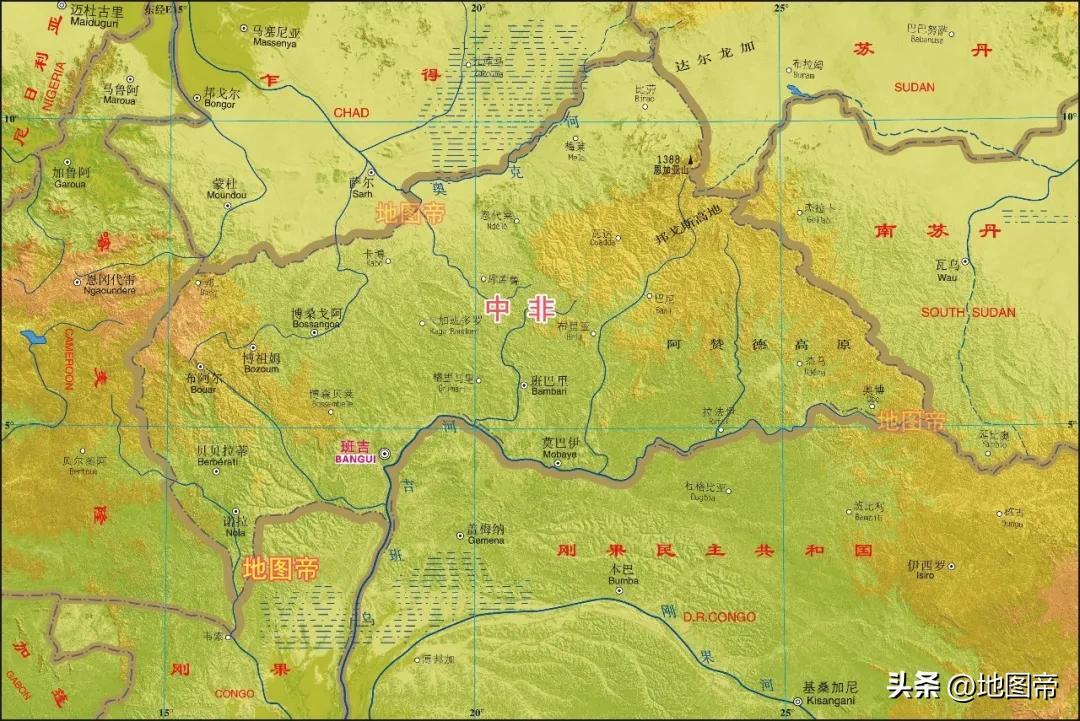 中非整體上處於高原地帶,地勢高亢,丘陵起伏,最高峯爲東部邦戈高原的恩加亞山,海拔1388米。