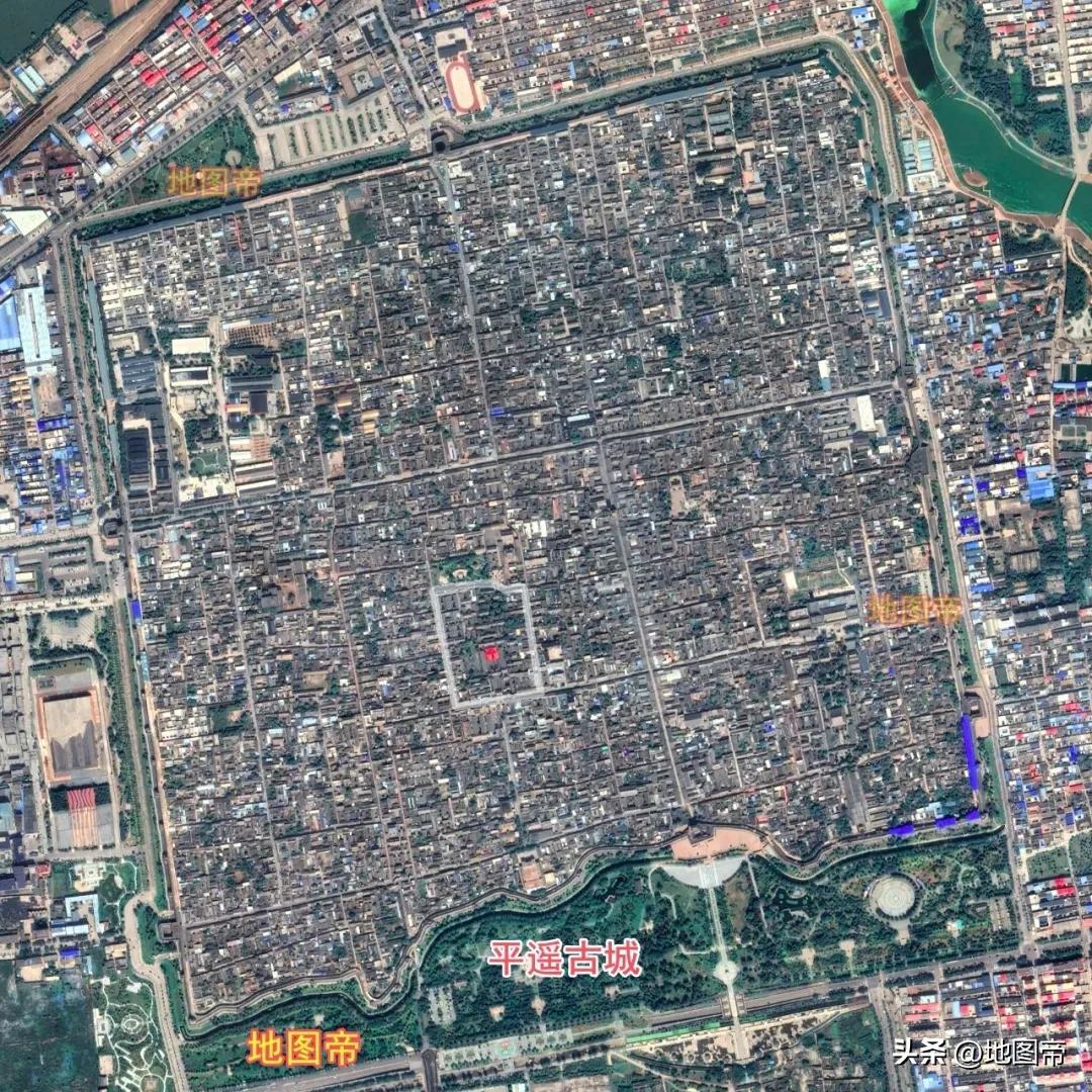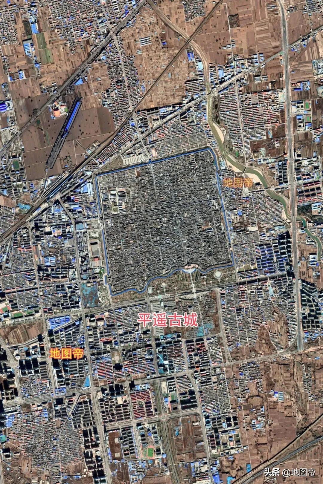 平遙古城東、西、北三面都是直線,南牆則因地制宜,沿着河道彎曲,周長約6千米,面積約2.25平方千米。