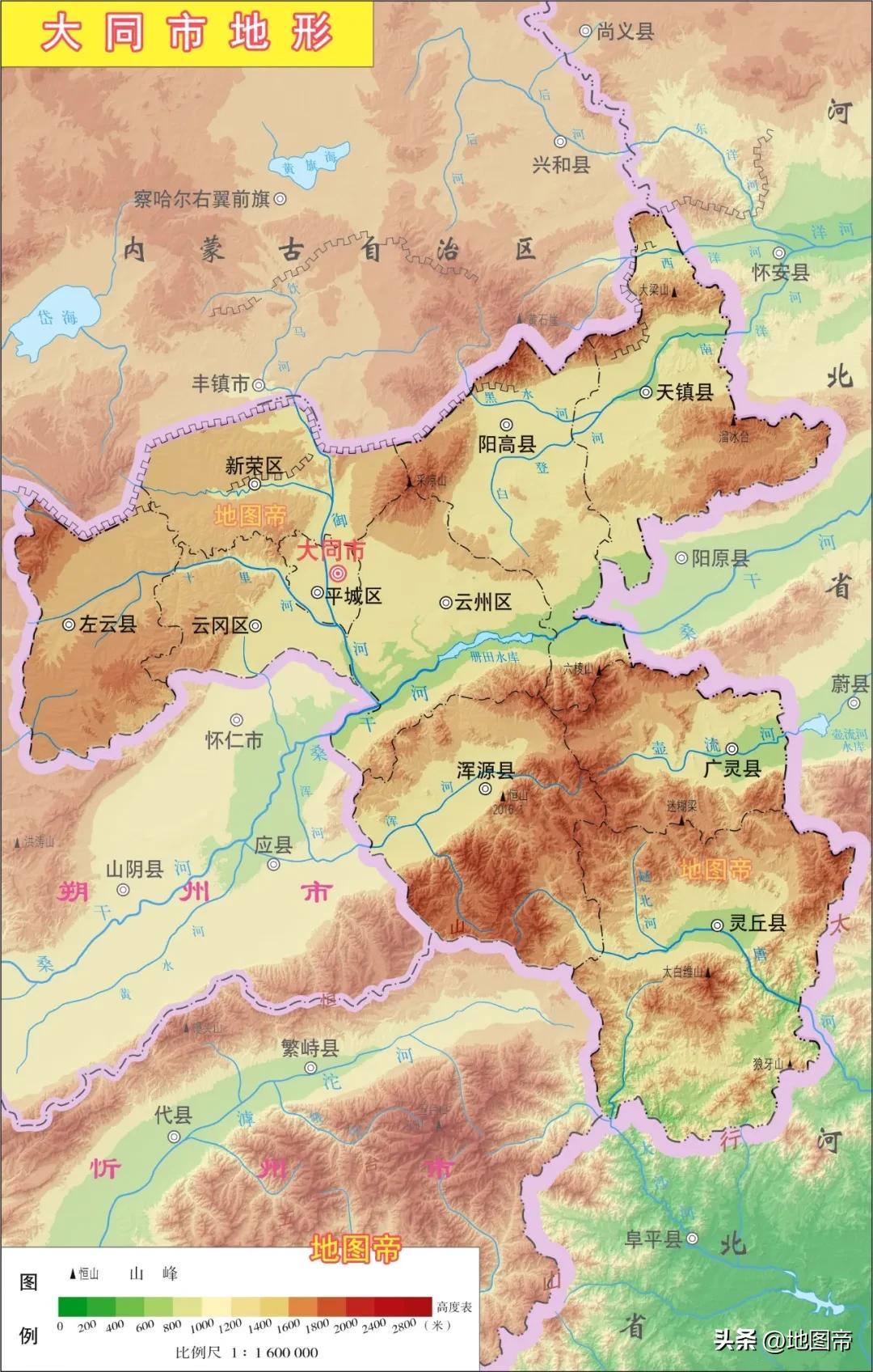 大同多山,山地、丘陵、臺地佔比約77%,平川和盆地佔23%,北部從西往東爲呂梁山脈的洪壽山,陰山山脈的採涼山、溜冰臺、玄兒山,東南部爲太行山脈的恆山(五嶽之一),北邊是長城。大同大部分地區海拔在1000米-1500米,最高峯爲六棱山黃羊尖,海拔約2420米;最低處爲冉河出口處,海拔約558米。
