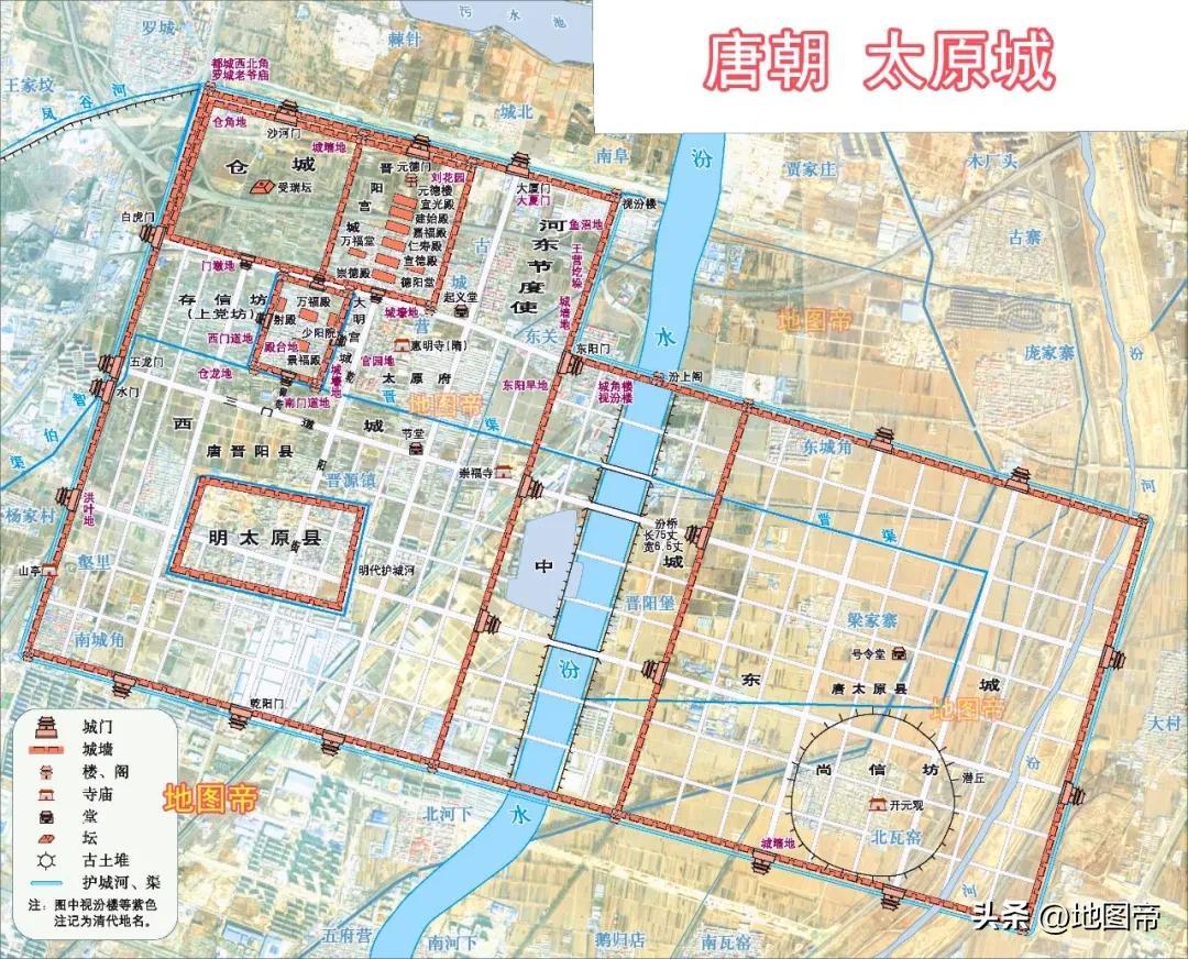 唐朝太原古城開24座城門,東西十二里、南北八里多,周長四十二里,遠勝於現存的明清太原城。