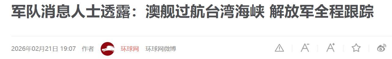 1.《軍隊消息人士透露:澳艦過航臺灣海峽 解放軍全程跟蹤》2026年02月21日 19:07| 來源:環球網