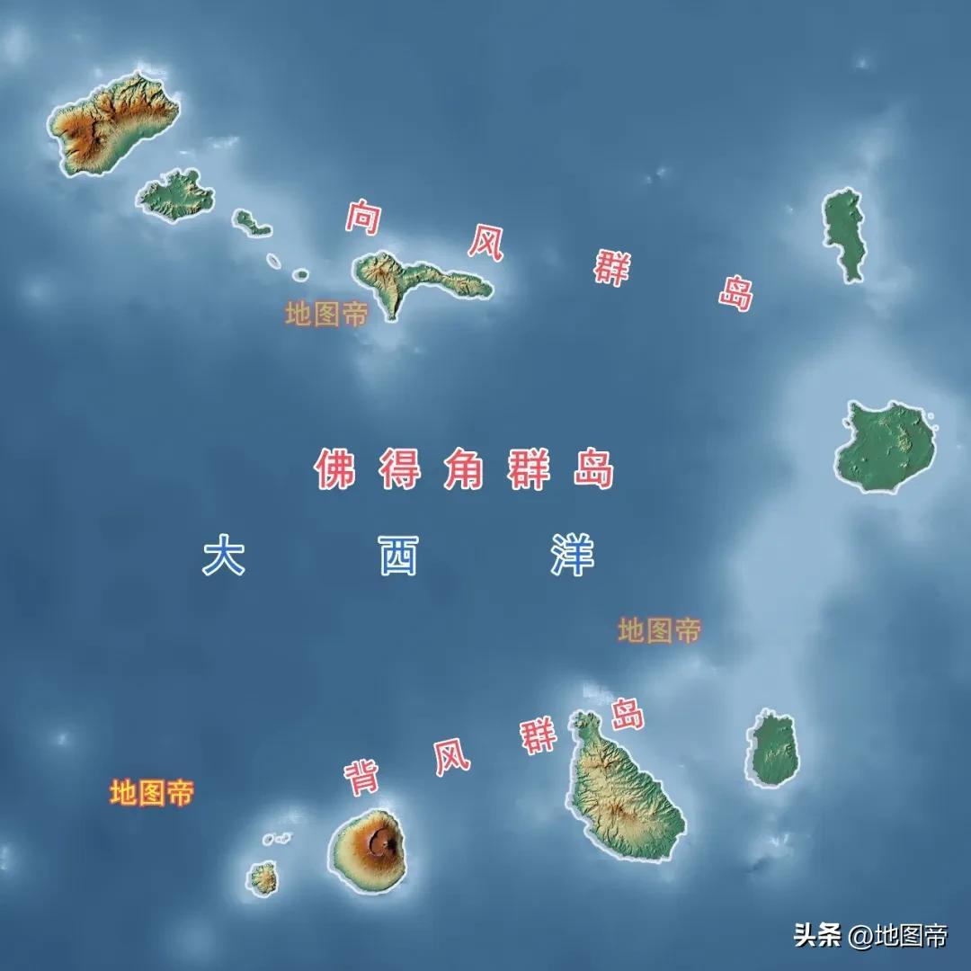 佛得角羣島位於非洲大陸西側,分爲南北兩部分,北爲向風羣島,南爲背風羣島。