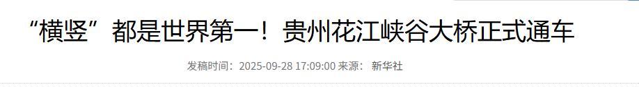 1.《“橫豎”都是世界第一!貴州花江峽谷大橋正式通車》2025-09-28 17:09:00| 來源:新華社