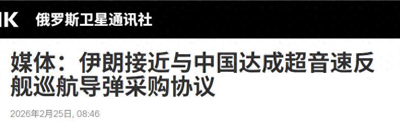 1.《媒體:伊朗接近與中國達成超音速反艦巡航導彈採購協議》2026年2月25日08:46| 來源:俄羅斯衛星吸通訊社