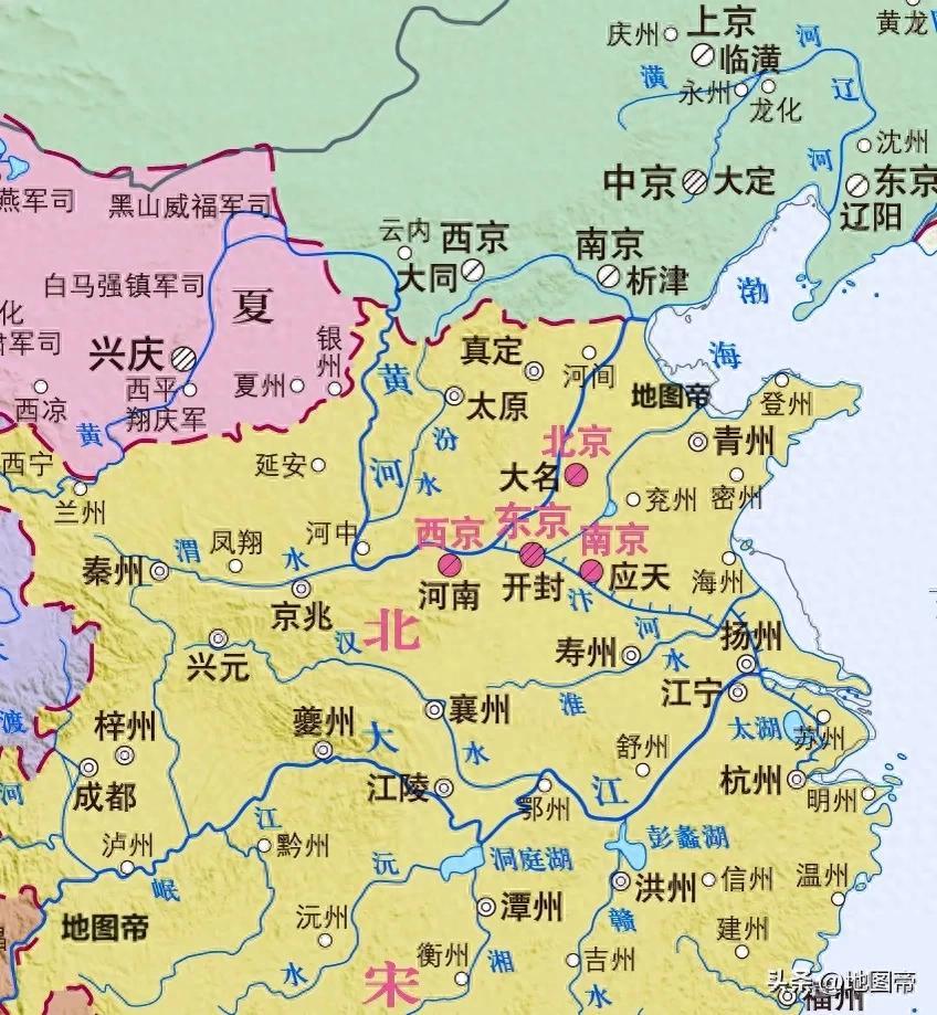 北宋四京分別是:東京開封府(今河南開封),西京河南府(今河南洛陽),北京大名府(今河北邯鄲大名縣),南京應天府(今河南商丘),其中都城是東京開封府。