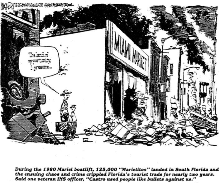 誰料卡斯特羅在1980年來了一手騷操作,藉着美國無條件接納古巴難民,把古巴的囚犯、精神病和社會閒散人員統統塞給了美國,讓佛羅里達的治安原地爆炸。