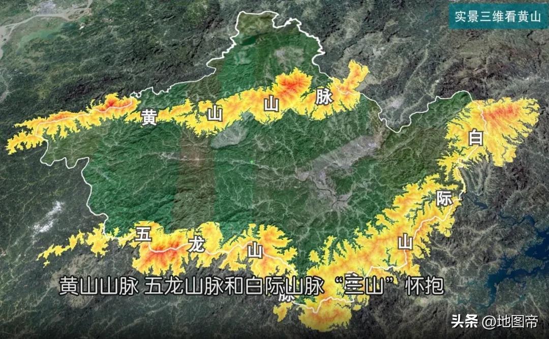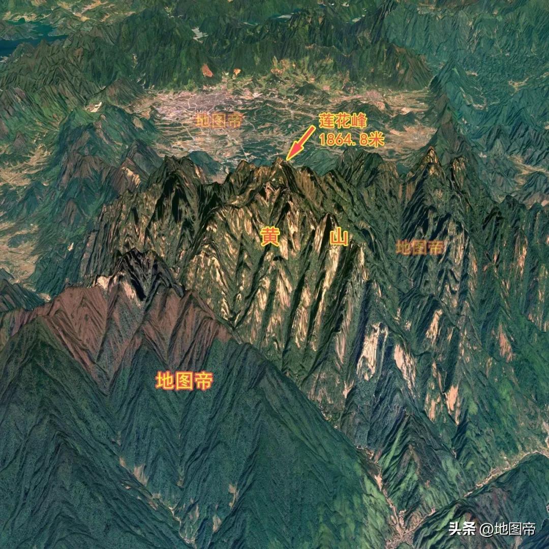 黃山古稱黟山,因峯巖青黑,遙望蒼黛而名,相傳爲軒轅黃帝“棲真之地”。唐玄宗崇尚黃老,敕改爲黃山。黃山山脈東西狹長,有130多千米,狹義的黃山東西長30千米,南北寬40千米。
