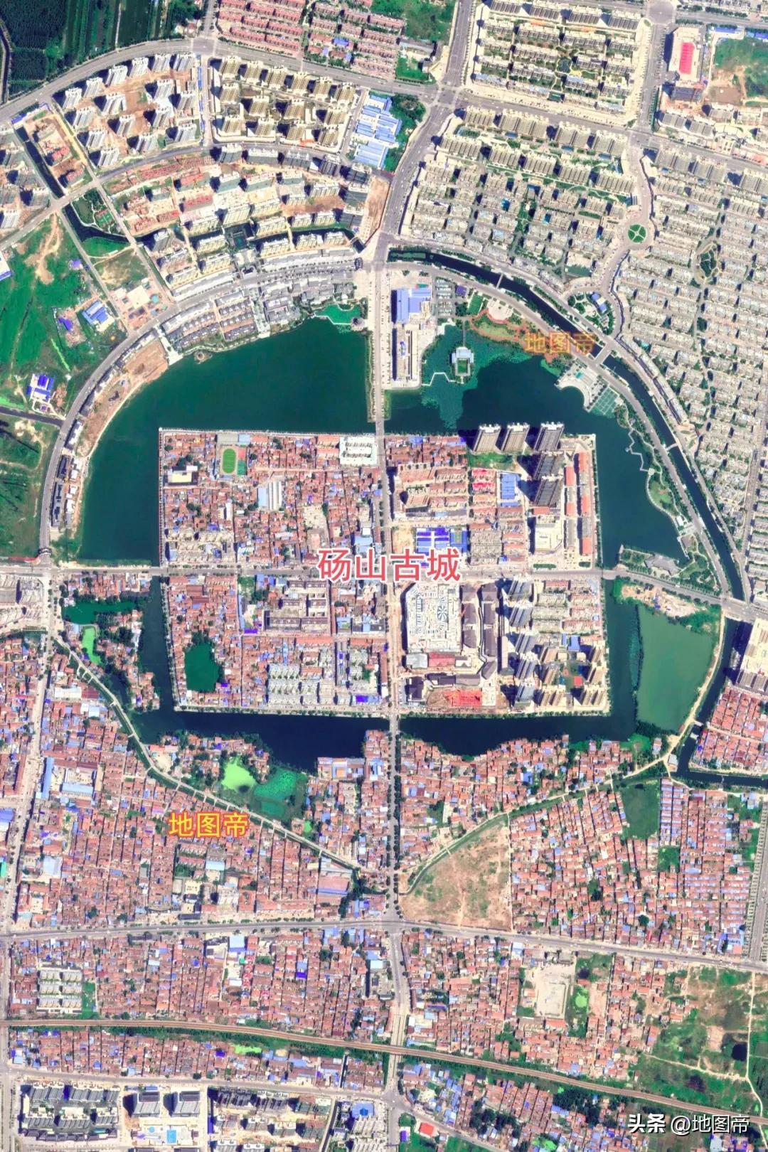 碭山古城,外圓內方,城牆呈方形,面積0.62平方千米,護城河呈圓形,面積1.6平方千米(環湖公路內)。碭山古城開四門:景雲門(東),永保門(南),瑞洛門(西),企寧門(北)。