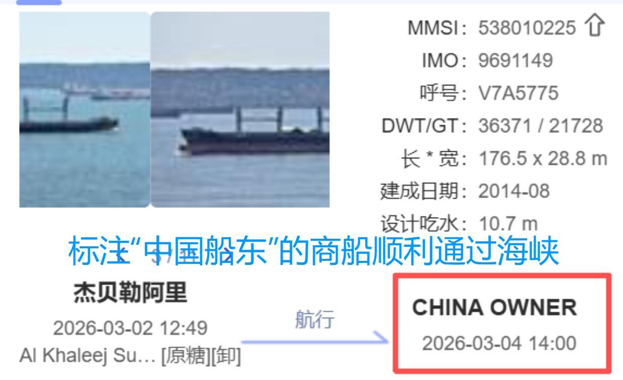 美國彭博社報道,3月5日凌晨,一艘名爲“Iron Maiden”(鐵娘子號)的散貨船將AIS(船舶自動識別系統)信號從“For Orders”(待指示)改爲“CHINA OWNER”(中國所有),沿阿曼海岸線安全穿越海峽。這是首例公開確認的“中國標籤”船隻通過案例。該船自去年12月起在波斯灣運貨,運營方爲上海Cetus Maritime Ltd.(中遠系關聯公司)。