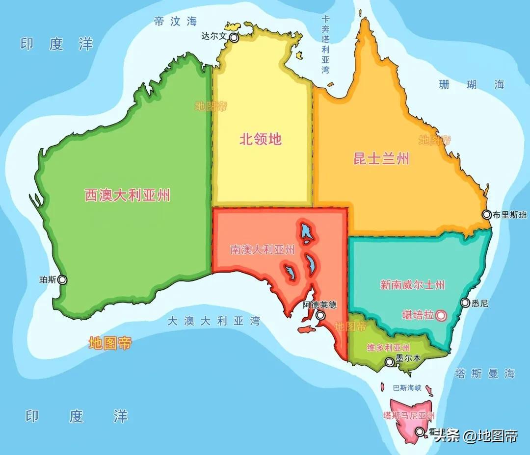 澳大利亞有6個州和2個地區:新南威爾士州、維多利亞州、昆士蘭州、南澳大利亞州、西澳大利亞州、塔斯馬尼亞州、北領地、首都領地。