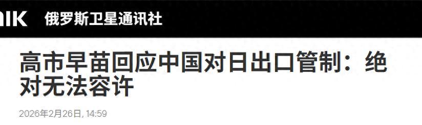 1.《高市早苗回應中國對日出口管制:絕對無法容許》2026年2月26日14:59| 來源:俄羅斯衛星通訊社