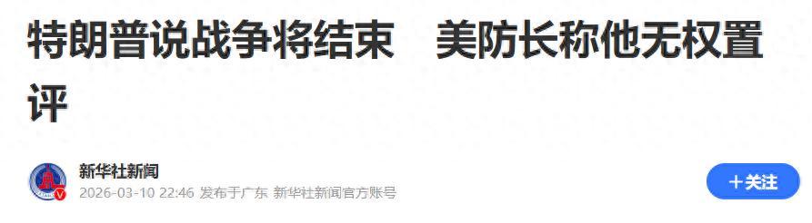 1.《特朗普說戰爭將結束 美防長稱他無權置評》2026-03-10 22:46| 來源:新華社