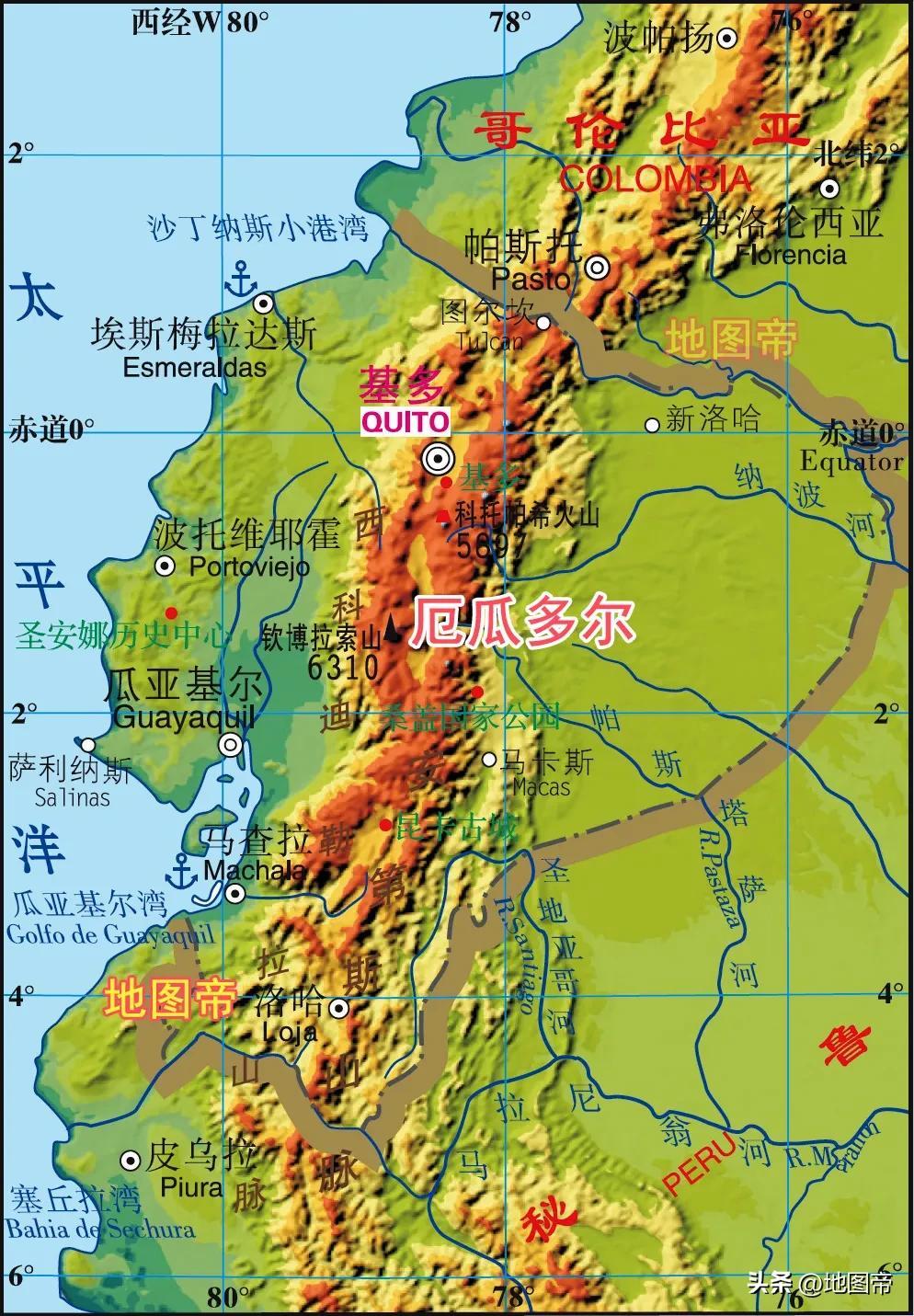 在基多城北26千米處,修建了一座赤道紀念碑,緯度是南緯00°00′08″。