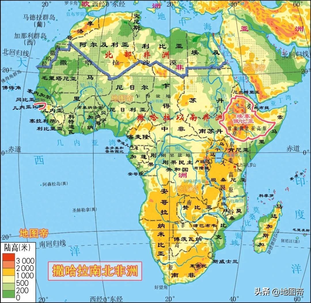 埃塞俄比亞高原,平均海拔約爲4000米,跨埃塞俄比亞、厄立特里亞和索馬里,面積約80多萬平方千米。