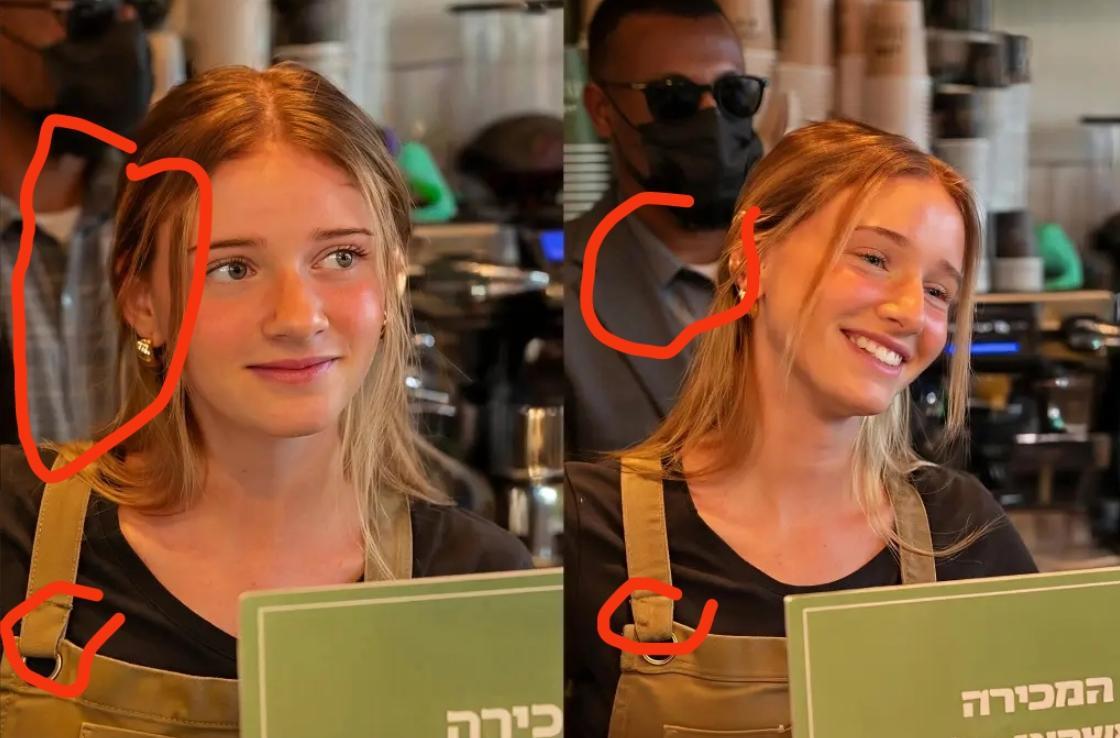 網友們抓着這段“自證視頻”逐幀分析,還真找出了不少可疑之處,包括但不限於“拿咖啡的時候咖啡液麪明顯高於杯口卻沒撒”、“喝了咖啡後嘴邊白沫瞬間消失”、“內塔尼亞胡的牙齒形狀不對”、“視頻中人物衣着突然變化”等。