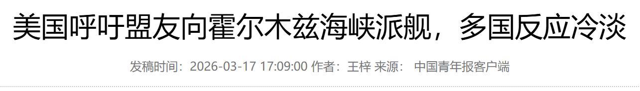 《美國呼籲盟友向霍爾木茲海峽派艦,多國反應冷淡》2026-03-17 來源: 中國青年報客戶端