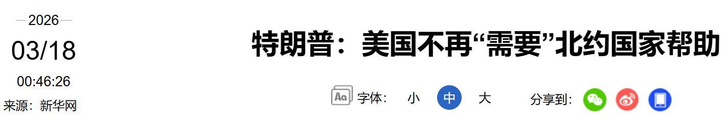 《特朗普:美國不再“需要”北約國家幫助》2026/03/18 來源:新華網