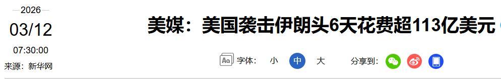 《美媒:美國襲擊伊朗頭6天花費超113億美元》2026/03/12 來源:新華網