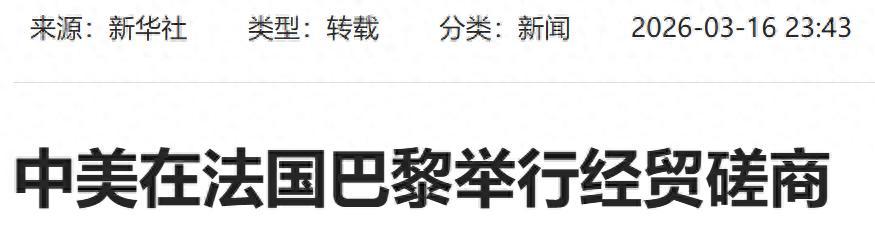 《中美在法國巴黎舉行經貿磋商》2026-03-16 來源:新華社