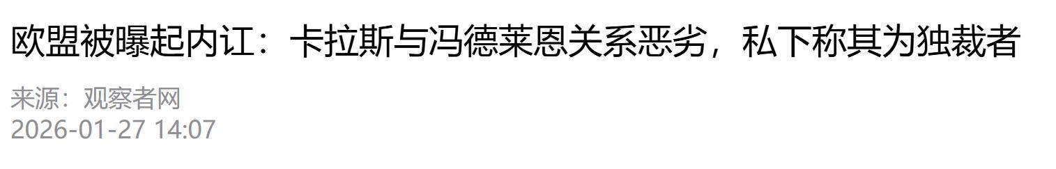 《歐盟被曝起內訌:卡拉斯與馮德萊恩關係惡劣,私下稱其爲獨裁者》 2026-01-27 來源:觀察者網