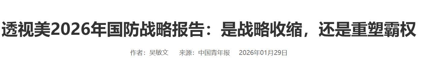 《透視美2026年國防戰略報告:是戰略收縮,還是重塑霸權》2026年01月29日 來源:中國青年報