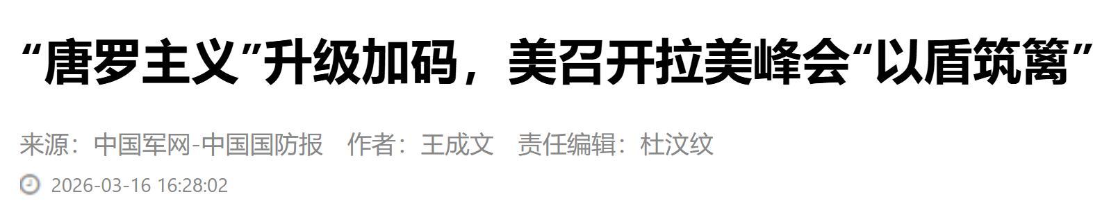 《“唐羅主義”升級加碼,美召開拉美峯會“以盾築籬”》2026-03-16 來源:中國軍網-中國國防報