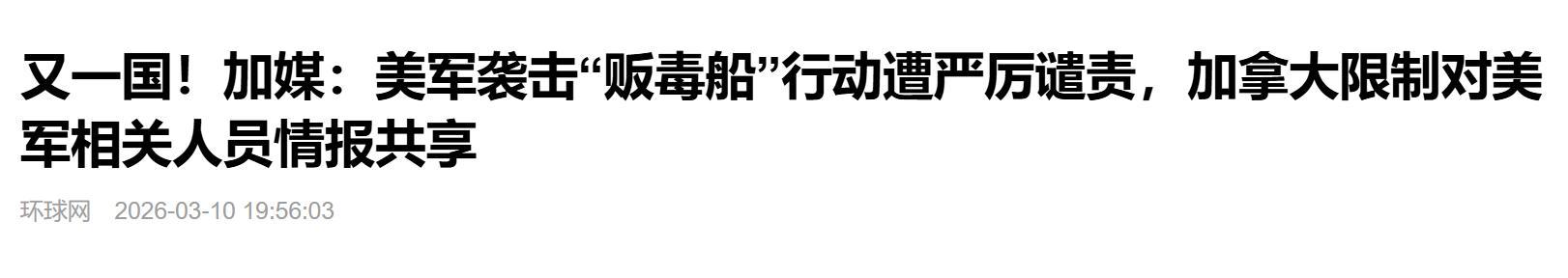 《又一國!加媒:美軍襲擊“販毒船”行動遭嚴厲譴責,加拿大限制對美軍相關人員情報共享》2026-03-10 來源:環球網