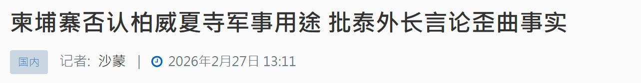 《柬埔寨否認柏威夏寺軍事用途 批泰外長言論歪曲事實》2026年2月27日 來源:柬中時報