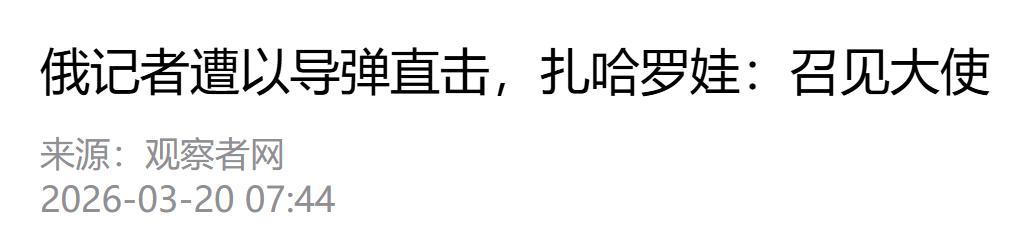 《俄記者遭以導彈直擊,扎哈羅娃:召見大使》2026-03-20 來源:觀察者網