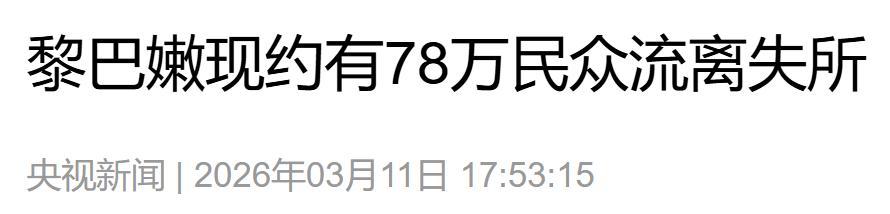 《黎巴嫩現約有78萬民衆流離失所》2026年03月11日 來源:央視新聞