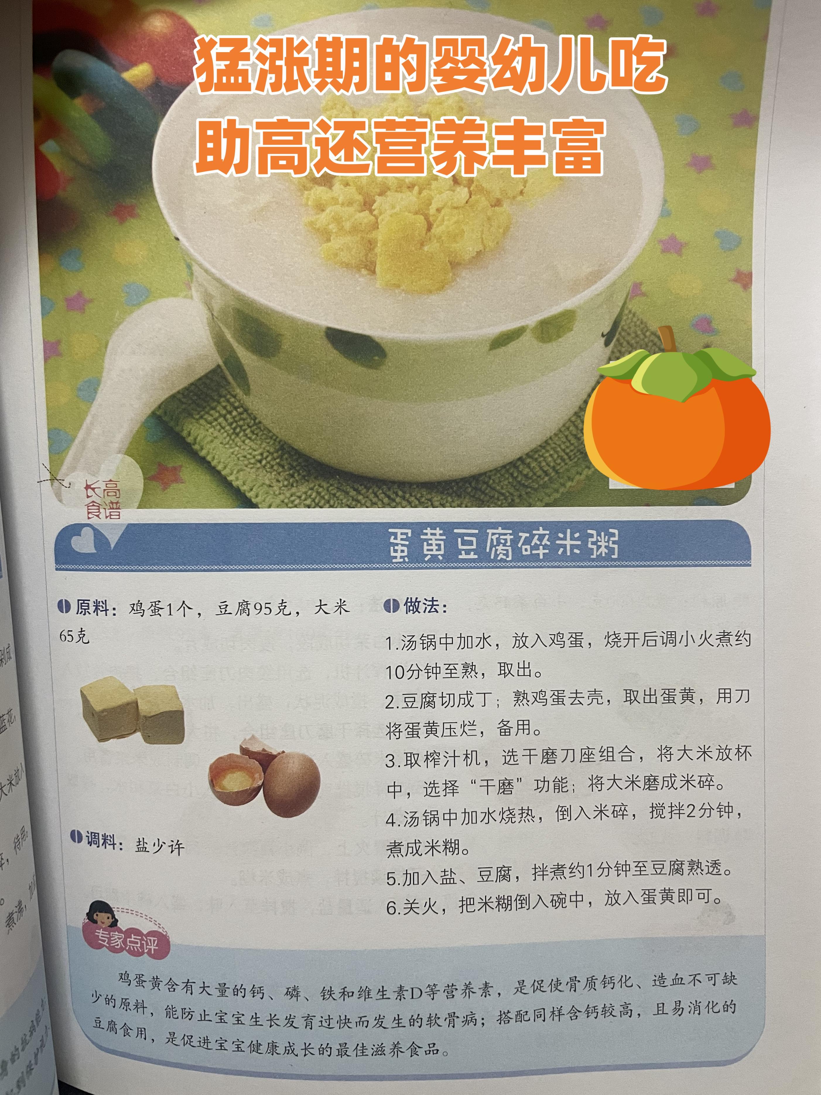 例如,蛋黃豆腐碎米粥,其中雞蛋黃裏含有大量的鈣磷鐵,以及維生素D,可以促進寶寶長個。