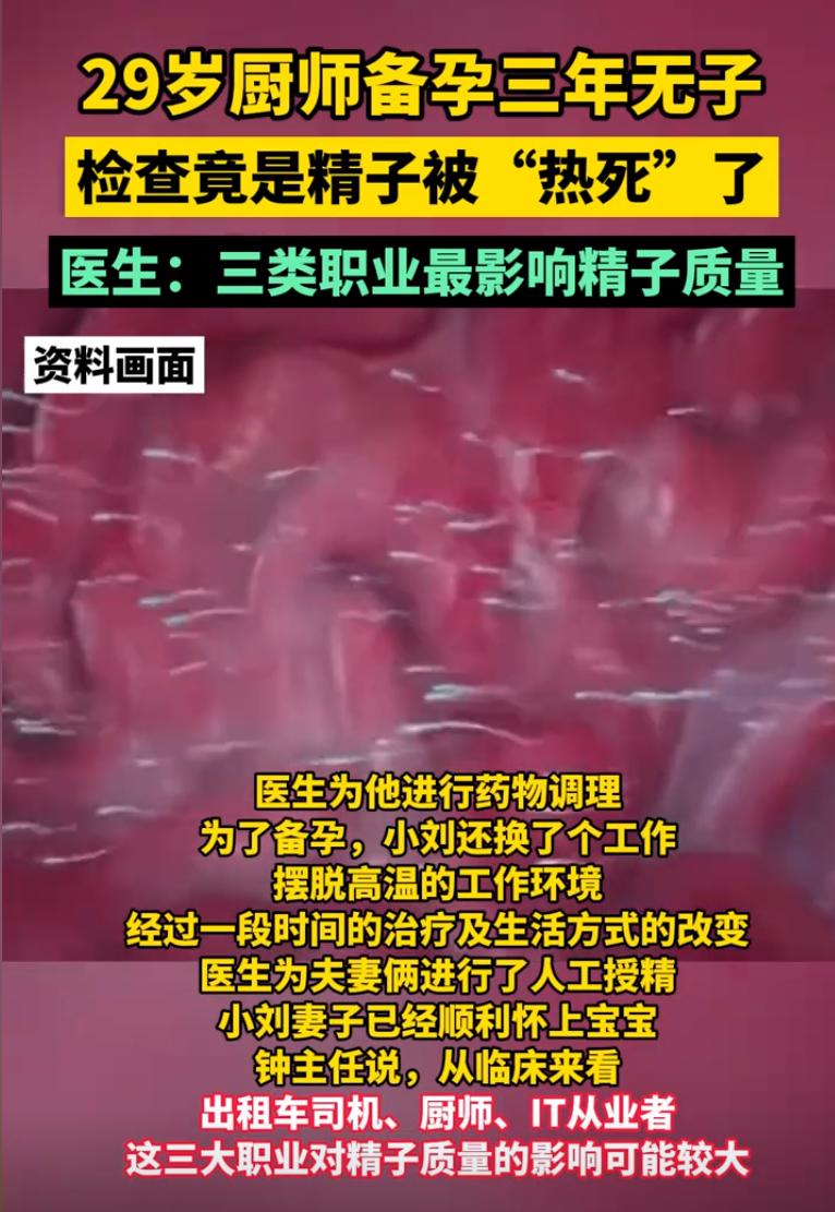 然後瞭解到她的老公是開飯店的,而且是每天要做菜,就說估計是因爲廚師做菜的時候,溫度太高,導致精子的活性下降,而這樣的情況也沒有什麼好的治療方案,也就是不用治療,就建議是離開這個熱的環境,也就是不再做菜,大概半年基本上就能好了。