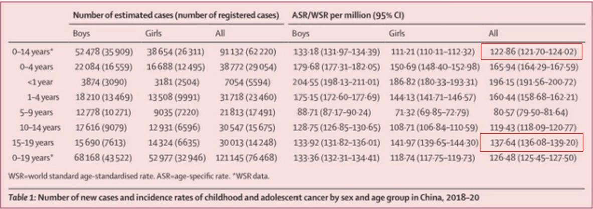 國家兒童癌症監測中心:中國青少年的癌症發病率爲137.64/百萬,兒童爲122.86/百萬。