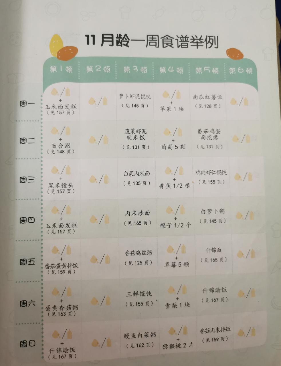 裏面就會告訴我們不同月齡孩子的奶量和輔食要怎麼安排,有一個輔食添加每週計劃食譜的舉例,六個月到三歲的都有,裏面就會告訴我們孩子每一頓是要喫奶還是喫輔食,如果是喝奶的話要喝多少?喫輔食的話又要喫多少?這些都會說得很詳細。