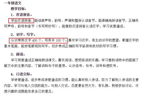 從上圖中得知,一年級語文教學的目標重點就是拼音跟識字,要求識字量在400左右。