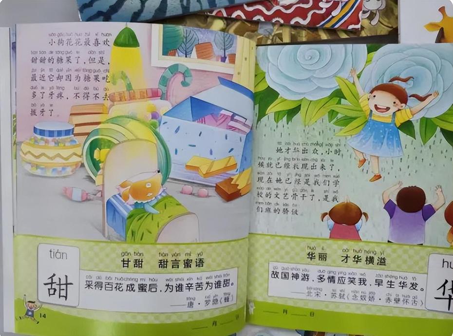 比如這一頁的“甜”字,組詞是“甘甜、甜言蜜語”,引入的故事是唐代•羅隱的《蜂》,採得百花成蜜後,爲誰辛苦爲誰甜。