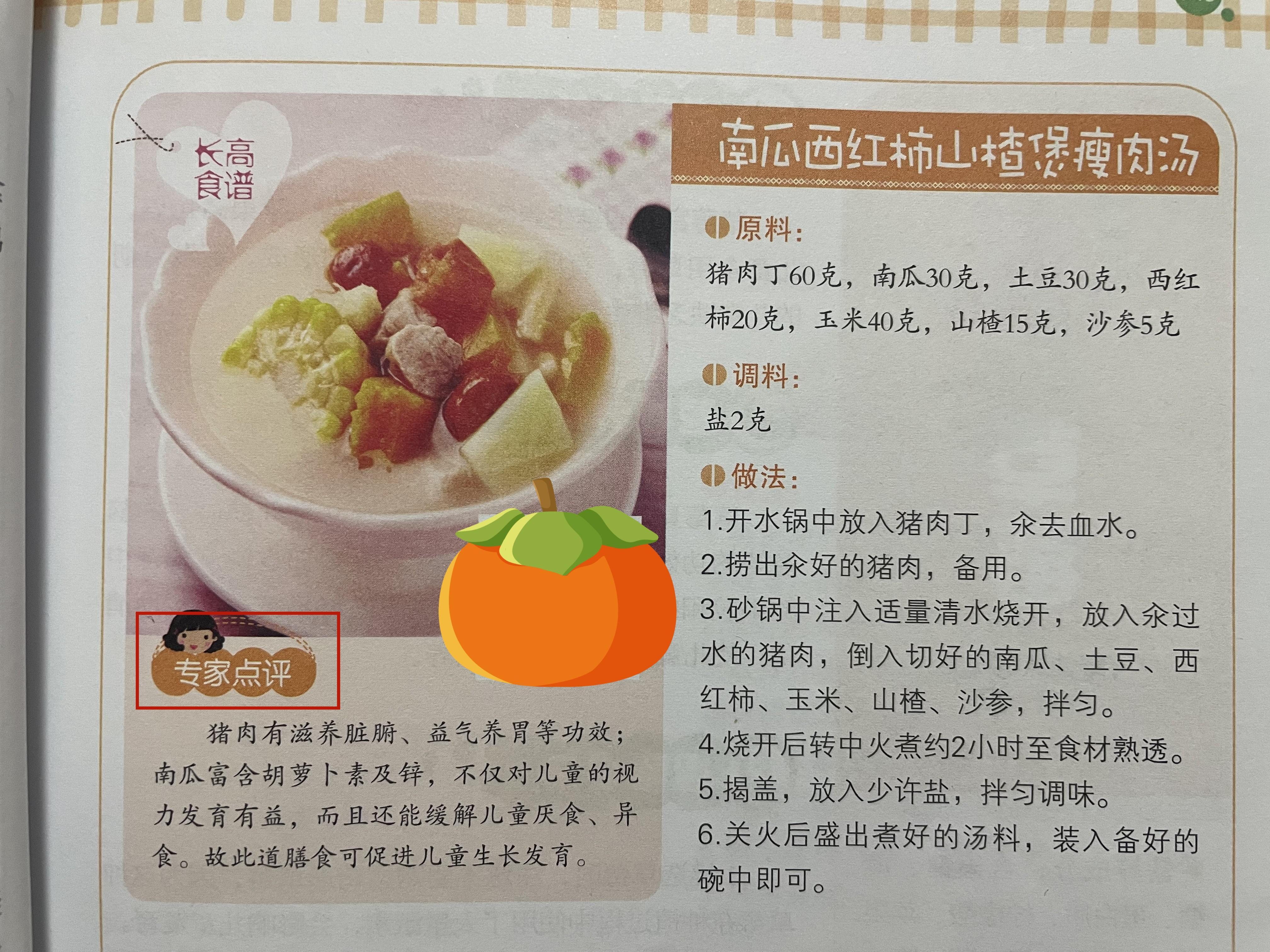 更讓媽媽放心的是,每道食譜中都有專家點評。這道南瓜西紅柿山楂煲瘦肉湯,就具有滋養臟腑,養胃益氣的功效,而且南瓜含有胡蘿蔔素,還能有益於孩子的視力發育,作用頗多,對孩子的生長髮育好。