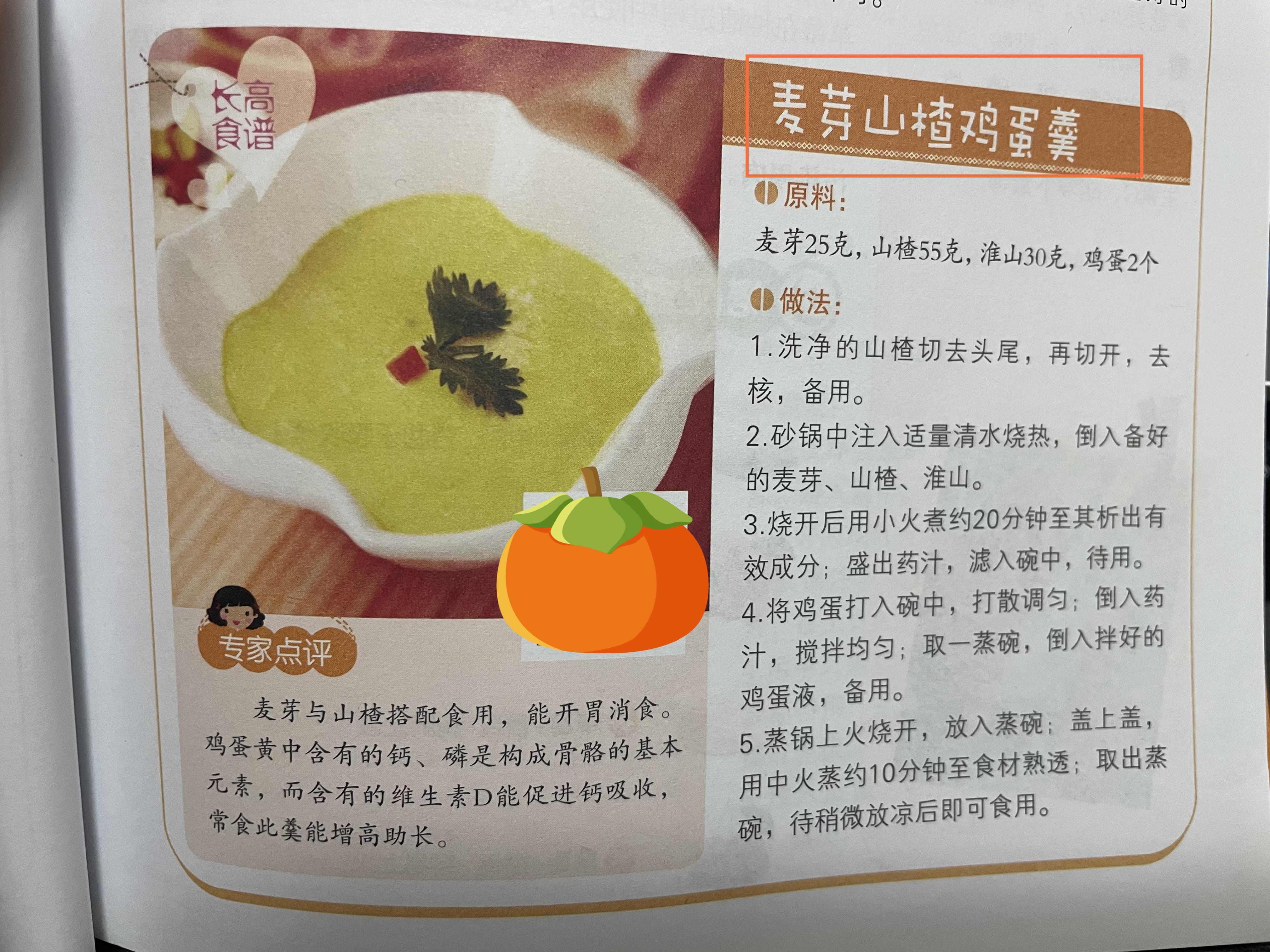 再比如,麥芽山楂雞蛋羹,這道平時家長可能都想不起來給孩子做的美食,卻很有助高追高的功效。需要準備的原料和製作方法,都在書中有介紹。