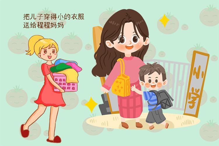 臭臭10歲,程程7歲,兩家人感情很好,臭臭媽媽也很感激程程媽媽,就經常把兒子穿得小的衣服送給程程媽媽。