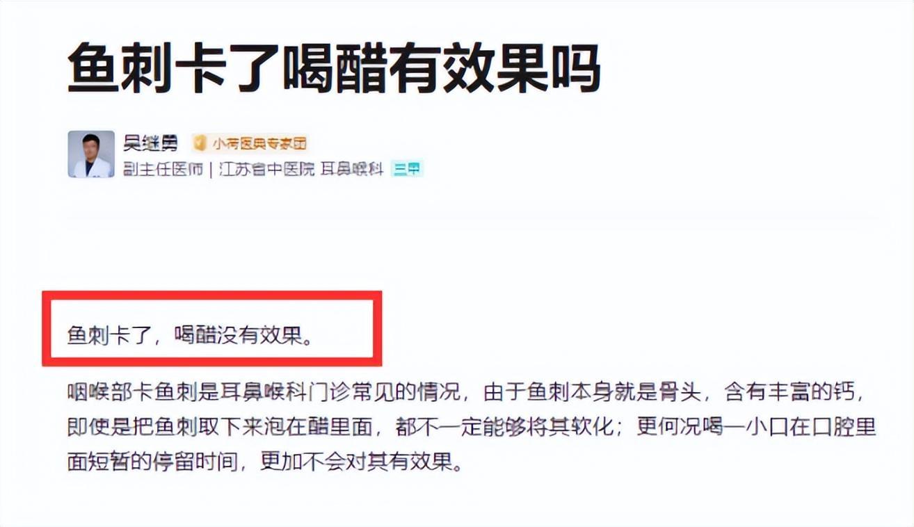 醫生說,通過喝醋來吞嚥魚刺的方法是錯誤的,喝醋不僅不能起到軟化魚刺的作用,還可能延誤就治時間。