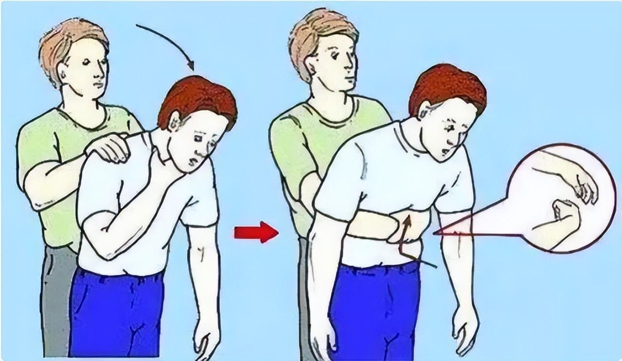 第二步:站在背後的人,雙手從異物卡喉者雙肩伸過去,一手握拳,另一隻手環扣拳頭,抵住肚臍至肋骨下緣之間,多次向上向後快速衝擊,直到異物或魚刺,自己“跑出來”。