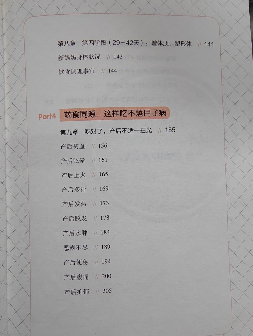 還有一些產後不適症狀的調理食譜,比如說產後貧血,產後上火,產後多汗,產後發熱,產後脫髮,產後水腫,產後便祕,產後抑鬱等等這些也都有詳細的食譜來喫。