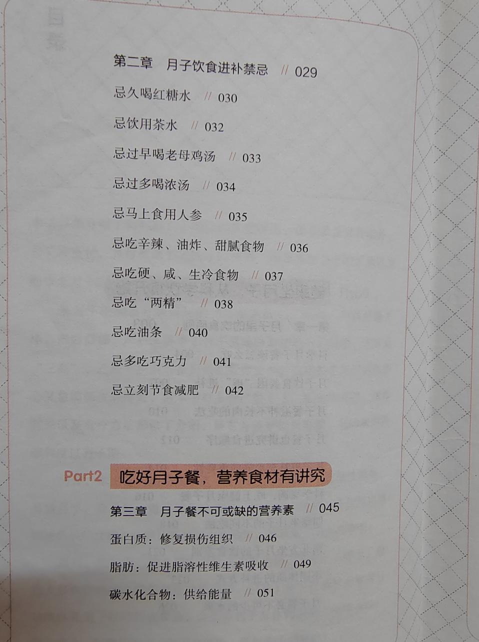 這本書是由一個母嬰機構撰寫的,裏面會告訴我們在坐月子的時候飲食要怎麼喫,以及在坐月子的時候我們的月子餐有什麼樣的禁忌?比如說忌久喝紅糖水,忌過早的喝老母雞湯,忌過多喝濃湯,忌馬上食用人蔘,忌喫油條,忌多喫巧克力等等。