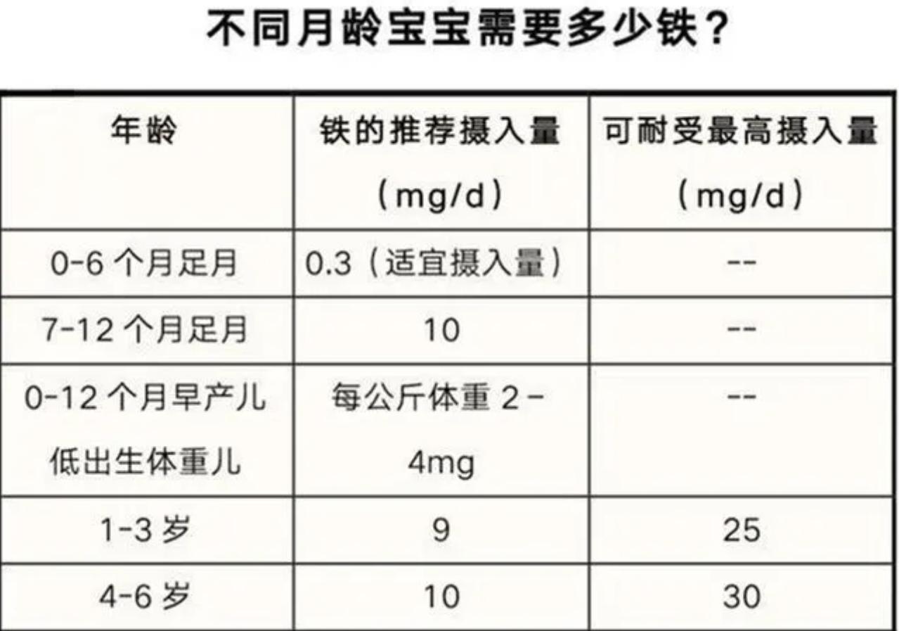 孩子在6個月之前每天只需要0.3毫克的鐵,通過喝母乳或者喝奶粉就能滿足孩子生長髮育的需求。但是到了孩子7個月之後,每天需要10毫克的鐵,這時候單喝母乳或者喝奶粉是不能滿足鐵的需求,所以給孩子添加輔食的時候一定要注意補鐵。